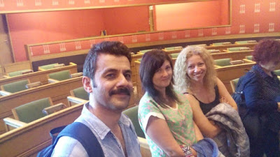 | Tyrkiske Metin, latviske koordinatoren Aina og den greske koordinatoren Chryssa på plass i bystyresalen. |